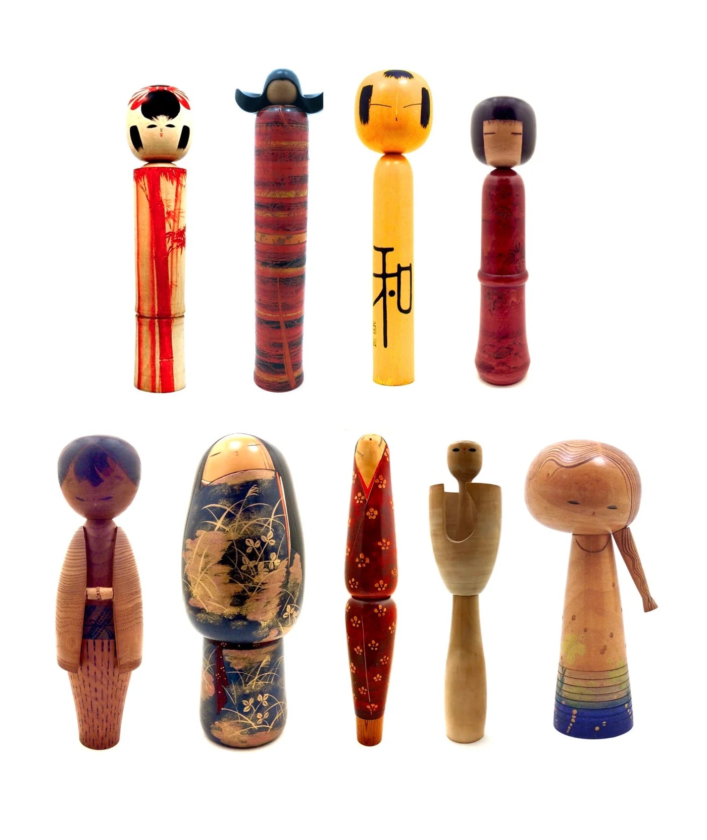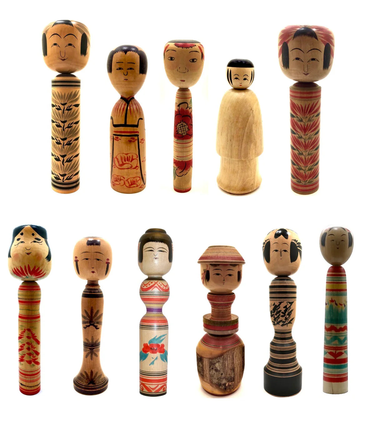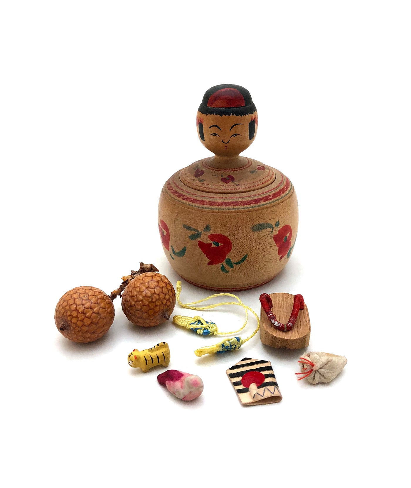 Shown are two rare lathe-turned, and elaborately hand painted wooden dolls featuring the Japanese red-crested crane, supporting the ancient legend of promising good luck and long life. A special gift given to a couple upon their marriage, its history is deep and powerful, and its symbolism is a moving message of hope and unconditional love, for Tsuru are monogamous, supporting the basis for marriage, as the crane depicted on precious objects has always been a strong symbol of success and good fortune in Japanese culture.