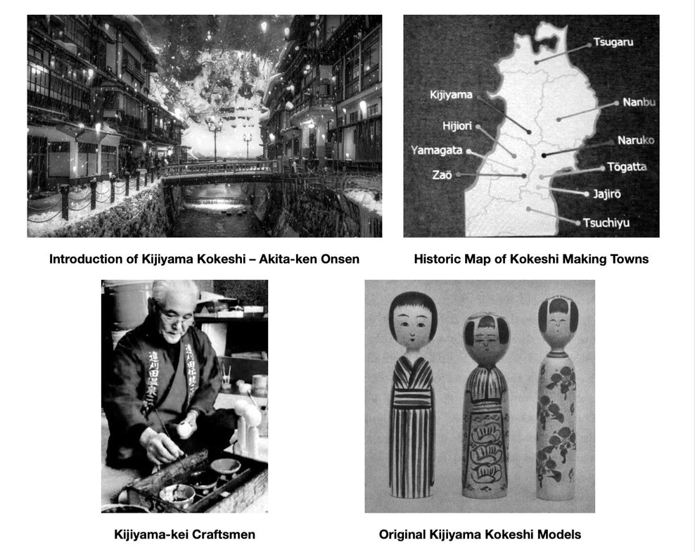 One of the most readily recognizable traditional dolls is the Kijiyama type, from the region of the same name in the Akita Prefecture. The name is derived from the wood craftsmen (Kiji-ya), who live in the remote mountains of the Tohoku region. The actual location of Kijiyama is so remote that it was inaccessible in the harsh winter months. Many of the kokeshi makers left and settled in the less remote areas of Kawazura, now part of Inagawa-machi. Some suggest that the dignified, lonely look on the faces of Kiiyama kokeshi reflects the lonesome past of their birthplace.